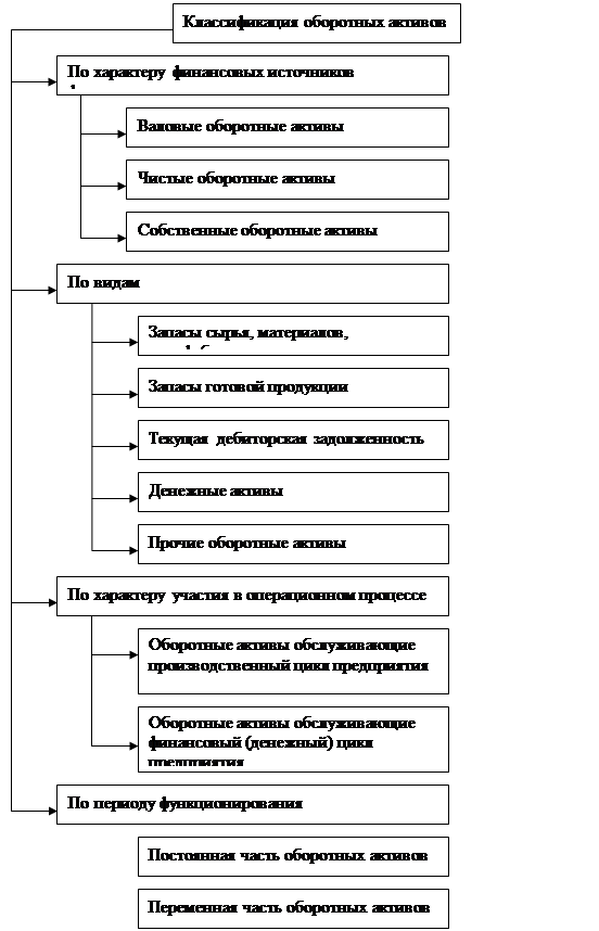 Рис. 1.1. Классификация оборотных активов 2. Виды оборотных активов. По этому признаку они классифицируются следующим образом: – Запасы сырья, материалов и полуфабрикатов. Этот вид оборотных активов характеризует объем входящих материальных их потоков в форме запасов, обеспечивающих производственную деятельность предприятия. – Запасы готовой продукции. Этот вид оборотных активов характеризует объем выходящих материальных их потоков в форме запасов произведенной продукции, предназначенной к реализации. К этому виду оборотных активов добавляют объем незавершенного производства. При значительном объеме и продолжительности цикла незавершенного производства его выделяют в отдельный вид оборотных активов. – Текущая дебиторская задолженность. Она характеризует сумму задолженности в пользу предприятия, представленную финансовыми обязательствами юридических и физических лиц по расчетам за товары, работы, услуги, выданные авансы и т.п. Дебиторская задолженность представляет собой весьма динамичный элемент оборотных средств, существенно зависящий от принятой в компании политики в отношении покупателей продукции. Дебиторская задолженность представляет собой отвлечение денежных средств из активного оборота, т.е. она невыгодна предприятию, поэтому напрашивается вывод о ее максимальном сокращении. Теоретически дебиторская задолженность может быть сведена до минимума, но этого не происходит по многим причинам, в том числе и по причине конкуренции. – Денежные активы. К ним относят не только остатки денежных средств в национальной и иностранной валюте, но и краткосрочные высоколиквидные финансовые инвестиции, свободно конверсируемые в денежные средства и характеризующиеся незначительным риском изменения стоимости. Система эффективного управления денежными средствами подразумевает выделение четырехкрупных блоков процедур: расчет финансового цикла; анализ движения денежных средств; прогнозирование денежных потоков; определение оптимального уровня денежных средств. – Прочие оборотные активы. К ним относятся оборотные активы, не включенные в состав вышерассмотренных их видов, если они отражаются в общей их сумме. 3. Характер участия в операционном процессе. В соответствии с этим признаком оборотные активы дифференцируются следующим образом: – Оборотные активы, обслуживающие производственный цикл предприятия (они представляют собой совокупность оборотных активов предприятия в форме запасов сырья, материалов и полуфабрикатов, объема незавершенной продукции и запасов готовой продукции); – Оборотные активы, обслуживающие финансовый (денежный) цикл предприятия представляют собой совокупность всех товарно-материальных запасов и суммы текущей дебиторской задолженности за вычетом суммы кредиторской задолженности. 4. Период функционирования оборотных активов. По этому признаку выделяют следующие их виды: – Постоянная часть оборотных активов, под которой, как правило, понимают минимально допустимую величину оборотных средств, необходимую для осуществления операционной деятельности, не зависящую от сезонных и иных колебаний объемов производства и реализации и не связанную с формированием запасов товарно-материальных ценностей сезонного хранения; – Переменная часть оборотных активов. Она представляет