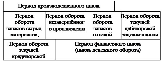 Рисунок 1.2. Характеристика движения оборотных активов в процессе их кругооборота Как видно из приведенного рисунка движение оборотных активов предприятия в процессе их кругооборота проходит четыре основных стадии, последовательно меняя свои формы. – На первой стадии денежные активы (включая их эквиваленты в форме краткосрочных финансовых инвестиций) используются для приобретения сырья и материалов, т.е. входящих запасов материальных оборотных активов. – На второй стадии входящие запасы материальных оборотных активов в результате непосредственной производственной деятельности превращаются в запасы готовой продукции. – На третьей стадии запасы готовой продукции реализуются потребителям и до наступления их оплаты преобразуются в текущую дебиторскую задолженность. На четвертой стадии инкассированная (т.е. оплаченная) текущая дебиторская задолженность вновь преобразуется в денежные активы (часть которых до их производственного востребования может храниться в форме высоколиквидных краткосрочных финансовых инвестиций). Важнейшей характеристикой операционного цикла, существенно влияющей на объем, структуру и эффективность использования оборотных активов, является его продолжительность. Она включает период времени от момента расходования предприятием денежных средств на приобретение входящих запасов материальных оборотных активов до поступления денег от дебиторов за реализованную им продукцию. Принципиальная формула, по которой рассчитывается продолжительность операционного цикла предприятия, имеет вид: ПОЦ =ПОмз + ПОт + ПОдз ПОЦ – продолжительность операционного цикла предприятия, в днях; ПОмз – продолжительность оборота запасов сырья, материалов и других материальных факторов производства в составе оборотных активов, в днях; ПОт – продолжительность оборота запасов готовой продукции, в днях; ПОдз – продолжительность инкассации текущей дебиторской задолженности, в днях. Финансовый цикл представляет собой период полного оборота денежных средств, инвестированных в оборотные средства, начиная с момента погашения кредиторской задолженности за сырье и материалы, полученные на условиях отсрочки платежа, и заканчивая инкассацией дебиторской задолженности, т.е. превращению задолженности в денежные средства. Продолжительность финансового цикла (или цикла денежного оборота) предприятия определяется по следующей формуле: ПФЦ = ППЦ + ПОдз - ПОкз ПФЦ – продолжительность финансового цикла денежного оборота, в днях; ППЦ – продолжительность производственного цикла предприятия, в днях; ПОдз – средний период оборота текущей дебиторской задолженности, в днях; ПОкз – средний период оборота текущей кредиторской задолженности, в днях. Ранее было рассмотрено понятие операционного цикла. Что касается финансовой деятельности, то одним из главных элементов которой является способность предприятия своевременно рассчитываться по своим обязательствам, необходимо также рассмотреть понятиемфинансового цикла. Финансовый цикл, или цикл обращения денежной наличности, представляет собой время, в течение которого денежные средства отвлечены из оборота. Между продолжительностью производственного и финансового циклов предприятия существует тесная связь, которая графически представлена на рис. 1.3.