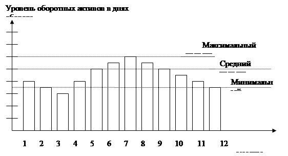 Рисунок 7.5. График «сезонной волны» уровня оборотных активов предприятия на протяжении года На третьей стадии определяется сумма постоянной части оборотных активов по следующей формуле: ОАпост = ОАп xКмин ОАпост – сумма постоянной части оборотных активов в предстоящем периоде; ОАп – средняя сумма оборотных активов предприятия в рассматриваемом предстоящем периоде; Кмин – коэффициент минимального уровня оборотных активов. На четвертой стадии определяется максимальная и средняя сумма переменной части оборотных активов в предстоящем периоде. Эти расчеты осуществляются по следующим формулам: ОАп макс = ОАп x (Кмакс - Кмин );