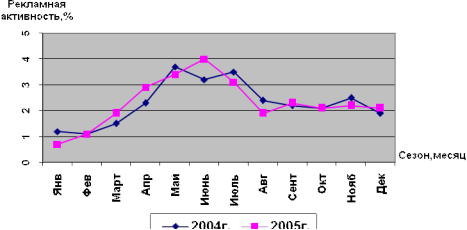 Вывод: Затраты на рекламу на рынке туристических услуг активно растет, начиная с 2000 года. Диаграмма 5 - Динамика затрат на рекламу в зависимости от сезона, в 2004-2005 г.: