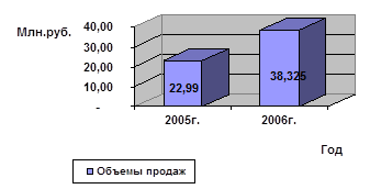 Согласно данным таблицы, можно сделать вывод, что активное использование Интернет-рекламы окажется рентабельным. Прибыль от использования этого вида рекламы увеличилась почти в два раза, Тд - в 1,6 раз, полученный эффект составил 5,270млн. руб., что в 2,5 раза больше, чем в 2005г., а число контактов стало более весомо =105. Несмотря на то, что расходы на Интернет - рекламу увеличились и составили 1,344 млн. руб., расчет рентабельности показал, что каждый расходованный рубль приносит почти 2 рубля прибыли. За счет исключения затрат на наружную рекламу упор был сделан на эффективное использование Интернет. Это в результате привело к тому, что затраты на рекламу в планируемом 2006г. составят 37,585 млн. руб., т.е. будут меньше на 2,210 млн. руб., чем в 2005г., но в это время объемы продаж увеличатся, что следует из диаграммы 6. Диаграмма - 6. Объемы продаж компании "Корал Тревел" в 2005г. и в планируемом 2006г.