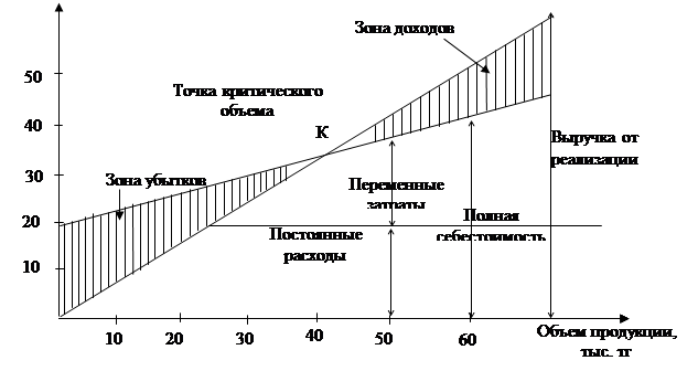 Возникает вопрос, при каком объеме выпуска (реализации) продукции предприятие достигнет точки критического объема, при которой доход от реализации равен ее общим издержкам (полной себестоимости), где нет ни дохода, ни убытков? Если фактический доход от реализации продукции будет выше, чем полная ее себестоимость, то предприятие будет иметь доход oт основной деятельности, а если наоборот, то понесет убытки. Подставив к приведенные выше формулы исходные данные, определим критическую величину объема производства, дохода (выручки) от реализации продукции, величину постоянных затрат, цену реализации и уровень минимального маржинального дохода. 1. Расчет критического объема производства: