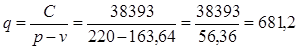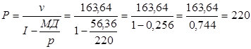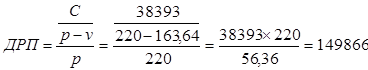 где р - продажная цена единицы продукции; q - количество единиц проданных изделий; v - переменные затраты на единицу продукции. С - постоянные затраты; Критический объем производства в натуральном выражении составляет 681,21 тыс. дал. Точку безубыточности можно рассчитать также в денежных единицах. Для этого достаточно умножить количество единиц продукции в точке безубыточности на цену единицы продукции: 681,21 х 220 = 149866 тыс. тенге. В профессиональной литературе точку безубыточности в денежном выражении называют критической величиной дохода (выручки) от реализации продукции, расчет которой осуществляется по формуле, приведенной ниже. 2. Расчет критической величины дохода (выручки) от реализации продукции: