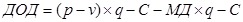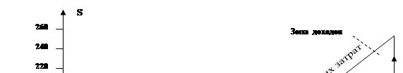Условные обозначения: ДРП - доход (выручка) от реализации; S - общие затраты (полная себестоимость реализованной продукции); V - общие переменные затраты: С - постоянные затраты; q - количество единиц продукции, тыс. дал; К - точка критического объема производства. Рисунок 9 - График безубыточности Для наглядного представления взаимосвязи общих, переменных и постоянных издержек с доходом (выручкой) от реализации продукции, маржинальным доходом и доходом от основной деятельности (производства данного вида продукции) используем графический метод. По вертикали (оси ординат, обозначаемой «Y») декартовых координат отложим данные о себестоимости и доход (выручку) oт реализации продукции, а по горизонтали (оси абсцисс, обозначаемой «X») - количество производимой продукции в натуре (рисунок 9). Приведенному графику можно дать следующую интерпретацию. Там, где пересекаются линии дохода (выручки) от реализации и себестоимости (точка К, соответствующая объему производства (681,21 тыс. дал), достигается состояние безубыточности, поскольку общий доход в этой точке в размере 149866 тыс. тенге (681,21x220) является достаточным для того чтобы покрыть постоянные затраты в размере 38393 тыс. тенге и переменные затраты в размере 111473 тыс. тенге (163,64 x 681,21). При объеме реализации ниже этой точки предприятие не может покрыть все затраты, и следовательно, оно получит не доход, а убытки. Напротив, при объеме реализации большем, чем критический, результат будет положительным, т.е. деятельность предприятия становится доходной. Зона убытков в графике расположена слева, а зона доходов - справа от критической точки объема производства. Оценивая релевантный ряд в графике от 200 тыс. до 1200 тыс. дал, можно сделать ввод, что каждая единица продукции, произведенная реализованная сверх 681,21 тыс. дал, будет приносить предприятию 56,36 тенге маржинального дохода, который равен цене реализации за вычетом переменных издержек (220 - 163,64). Таким образом, для обеспечения безубыточности производства маржинальный доход должен покрывать постоянные затраты. В точке безубыточности ее величина равна удельным постоянным затратам, что видно из следующих формул: p = се + v (9), где се - удельные постоянные затраты; p – v = ce ; МД = ce (10). При соблюдении этого правила каждая единица продукции не приносит ни дохода, ни убытка. Тогда: