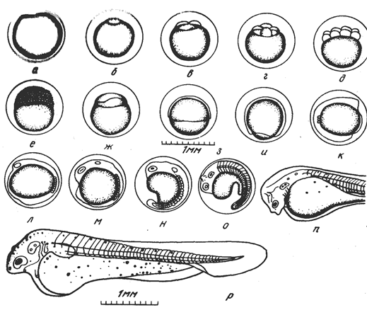 а — неоплодотворенная икра; б — набухшая икра с образовавшимся зародышевым диском (бластодиском); в — стадия 2-х бластомеров; г —стадия 4-х бластомеров; д — стадия 8-и бластомеров; е — стадия крупной морулы; ж — стадия бластулы; з — бластодерма охватывает половину желтка; и — стадия замыкания желточной пробки и появления зародышевого валика; к — стадия образов первых сомитов в туловище; л — стадия образования глазных пузырей; м — стадия формирования слуховых плакод; н — стадия формирования хрусталика; желточный мешок приобретает грушевидную форму; о — стадия начала пигментации глаз; п — стадия появления в крови форменных элементов; р — предличинка Рисунок 2 - Эмбриональный период развития карпа [10] Во время гаструляции происходит существенная структурная перестройка, в результате которой образуются три зародышевых листка: эктодерма, мезодерма и энтодерма. Обмен веществ во время гаструляции имеет особенности. В этот период создаются основы органогенеза. После гаструляции количество фосфора АТФ и небелкового азота снижается. А количество общего белка увеличивается. Процесс гаструляции является наиболее уязвимым к воздействия факторов внешней среды. Гаструляция всегда сопровождается повышенной гибелью икры. Поэтому учет отхода целесообразно проводить после этой стадии, а не раньше. На 4 – ом этапе происходит дифференциация головного и туловищного отделов эмбриона. Наблюдается утолщение головной и хвостовой частей эмбриона. Через 17 – 20 ч от оплодотворения икры тело зародыша охватывает около 3/5 окружности желтка. Начинается сегментация тела. В туловище образуются первые два-три сомита (рис. 2, к). В возрасте 22 – 24 ч формируются глазные пузырьки при продолжающейся сегментации тела (рис. 2, л). Через 24 – 28 ч за глазными пузырьками в области продолговатого мозга появляются слуховые плакоды (рис. 2, м). Количество сомитов достигает 9 – 11. Глазные бокалы (зачатки глаз) приобретают щелевидные углубления [10]. На 5 – м этапе обособляется хвостовой отдел и зародыш начинает двигаться. В результате обособления хвостового отдела и роста в длину зачатка кишечной трубки желток приобретает грушевидную форму. Через 35 – 45 ч в глазах отчетливо виден хрусталик (рис. 2, н). Количество сомитов продолжает увеличиваться (более 20). Тело эмбриона совершает слабые движения. В возрасте немногим долее двух суток наблюдается сегментация хвостового отдела. К этому времени сегментация тела почти заканчивается. В глазах появляется черный пигмент. Различаются отделы головного мозга. В слуховых капсулах образовываются отолиты (рис. 2, о). При обособлении хвостового отдела и пигментации глаз наступают определенные изменения в обмене веществ: показатель АТФ вновь возрастает до исходной величины, однако содержание белка и небелкового азота остается прежним, как при гаструляции. На 6 – ом этапе в возрасте 2,5 сут у эмбриона появляются форменные элементы в крови. Число сомитов в туловище 24, в хвостовом отделе 16. Глаза пигментированы (рис. 2, о). Сформировалась кожная жаберная крышка. Голова пригнута у желтку. На рыле перед глазами появились обонятельные ямки. Снизу образовалась ротовая воронка. Позади глаз появились четыре жаберные плакоды. На уровне первого миотома располагается грудной плавничок. Эмбрион активно вращается в оболочке. Эта стадия эмбрион карпа, 