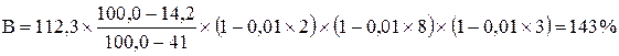 Влажность теста Wт , %, определяют исходя из влажности мякиша хлеба по формуле: где Wхл – влажность хлеба по стандарту, %; n – разница между влажностью теста и мякиша остывшего хлеба, %. Ориентировочно значения n можно принять для обойной муки 1,0…1,5%, пшеничной сортовой 0,5…2,0%, для ржано-пшеничной из технологической инструкции 0,5…1,0%. Хлеб «Белорусский»: Wт =40+1=41%. Батон молочный нарезной: Wт =40+1=41%. По формуле (5) определим выход В, %, изделий. Хлеб «Белорусский»: