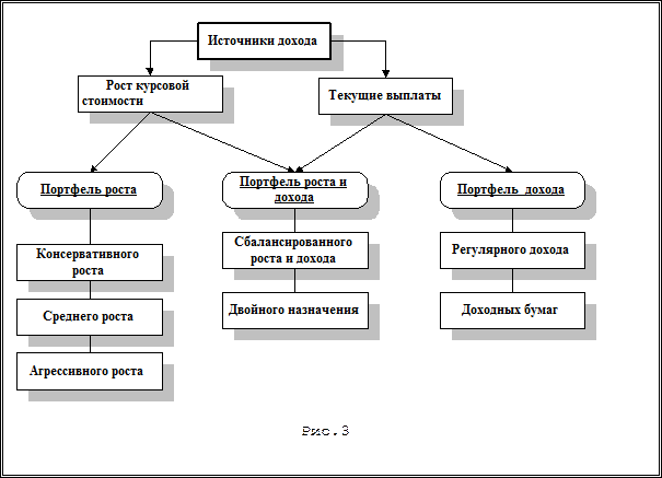 Сбалансированный портфель предполагает сбалансированность не только доходов, но и риска, который сопровождает операции с ценными бумагами, и поэтому в определенной пропорции состоит из ценных бумаг с быстрорастущей курсовой стоимостью и из высокодоходных ценных бумаг. В состав портфеля могут включаться и высоко рискованные ценные бумаги. Как правило, в состав данного портфеля включаются обыкновенные и привилегированные акции, а также облигации. В зависимости от конъюнктуры рынка в те или иные фондовые инструменты, включенные в данный портфель, вкладывается большая часть средств. Если рассматривать типы портфелей в зависимости от степени риска, который приемлет инвестор, то необходимо вспомнить их классификацию, согласно которой они делились на консервативные, умеренно-агрессивные, агрессивные и нерациональные. Ясно, что каждому типу инвестора будет соответствовать и свой тип портфеля ценных бумаг: высоконадежный, но низко доходный; диверсифицированный; рискованный, но высокодоходный, бессистемный. При дальнейшей классификации портфеля структурообразующими признаками могут выступать те инвестиционные качества, которые приобретет совокупность ценных бумаг, помещенная в данный портфель. При всем их многообразии из них можно выделить некоторые основные: ликвидность или освобождение от налогов, отраслевая региональная принадлежность. Такое инвестиционное качество портфеля, как ликвидность, как известно, означает возможность быстрого превращения портфеля в денежную наличность без потери его стоимости. Лучше всего данную задачу позволяют решить портфели денежного рынка. Портфели денежного рынка . Эта разновидность портфелей ставит своей целью полное сохранение капитала. В состав такого портфеля включает ся преимущественно денежная наличность или быстро реализуемые активы. Связь между типом инвестора и типом портфеля. Таблица 3