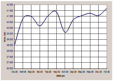 Загальний обсяг активів банків станом на 31.12.2009 становив 873449,57 млн. грн. і порівняно з аналогічним періодом 2008 року зменшився на 5,7% (станом на 31.12.2008 становив 926086,50 млн. грн.). Проаналізуємо кредитний ринок 2009 року на основі даних, наведених у додатку А. Так, по кредитам, наданим депозитними корпораціями будівельним організаціям спостерігається тенденція по зростанню обсягів: в січні обсяг кредитування становив 38 554 млн. грн. та в лютому спостерігається різке зростання на 5,9% і становить 40 822 млн. грн. Найбільші обсяги кредитування припадають на червень – 41 391 млн. грн. та грудень - 41 678 млн. грн. (рис. 2.1). Кредити, надані фізичним особам, протягом останніх двох років зростали вищими темпами, ніж кредити, надані суб’єктам господарювання.