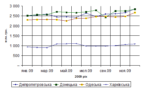 Рис. 2.1 Кредити, надані депозитними корпораціями (крім Національного банку України) будівельним організаціям Зазначимо, що з рисунку 2.1 видно, що поріг коливання обсягів кредитування складає 8% з позитивною динамікою. Тобто темпи зростання кредитних портфелів є досить низькими. При аналізі цих даних у розрізі регіонів можна зазначити наступне: - найбільший обсяг кредитів, наданих депозитними корпораціями припадає на Київську область та м. Київ – приблизно 65% від загального обсягу. При цьому найбільше було надано кредитів в цьому регіоні в період сезонних робіт – травень – червень; - в таких областях як Дніпропетровська, Донецька, Одеська, Херсонська, Харківська та Чернігівська спостерігається тенденція до зростання обсягів кредитів, що є позитивним і свідчить про процес як відновлення кредитування в економіці країни так і про процес одужання підприємств, а саме будівельних корпорацій, які на час кризи мали дуже скрутне становище (рис. 2.2). - в таких областях як Івано-Франківська, Кіровоградська, Миколаївська, Сумська та Черкаська спостерігається тенденція до зменшення обсягів кредитування.