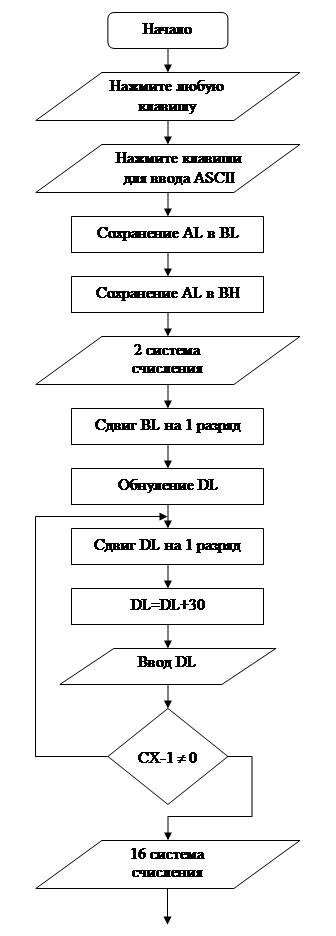 Рисунок 1.1 – Блок схема основной программы Основная программа Stac segment db 64 dup (0) ends data segment Msg db 13,10,'' System16 db 13,10,'16 б/б=$' System2 db 13,10,'2 б/б=$' Pystaya db 13,10,'$' stQ db 13,10,'' ends code segment assume ds:data, cs:code, ss:stac Start: mov ax, data mov ds, ax mov es, ax ;-------------------------------------------- c:; Вывод строки 'Нажмите любую клавишу...' mov ah, 09h lea dx , Msg int 21h ;Вывод ASCII код нажатой клавиши mov ah, 01h int 21h mov cx, 8; Занесение в CX кол-ва циклов mov bl, al; Сохранение AL в BL mov bh, al;Сохранение Al в BH ;Вывод строки э2 с/с=' mov ah, 09h lea dx, System2 int 21h m1: sal bl, 1; Сдвиг BL на 1 разряд mov dl, 0;Обнуление DL rcl dl, 1;Сдвиг dl на 1 разряд add dl, 30h; DL=DL+30 ;Вывод DL mov ah, 02h int 21h loop m1 ;Вывод строки '16 c/c=' mov ah, 09h lea dx, System16 int 21h mov bl, bh; Загрузкаисходного AL mov cx, 4 sar bl, cl;Сдвиг BL c 9 cmp bl, 9 ; Сравнение BL c 9 jle m2 ;Переход на m2 если <или= add bl, 37h; BL=BL+37 jmp m3; Переход на m3 m2: add bl, 30h;BL=BL+30 ;Вывод m3 m3: mov ah, 02h mov dl, bl int 21h mov bl, bh; Загрузка исходного AL and bl, 0Fh;Обнуление первых 4 разрядов cmp bl, 9;Сравнение bl c 9 jle m4 ; Переход на m4 если <или= add bl, 37h; BL=BL+37 jmp m6 ; Переход на m6 M4: add bl, 30h; BL=BL+30 ;Вывод BL M6: mov ah, 02h mov dl, bl int 21h mov ah, 09h lea dx, stQ int 21h mov ah, 02h int 16h and al,10000000b jz d mov ax, 4c00h int 21h d: jmp c ends END Start