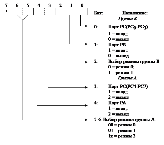 Рисунок 2.5 – Формат регистра управления ППИ Режим 0 – основной режим Ввода – вывода (однонаправленный синхронный обмен).В этом режиме группа разделяется на два набора (порт и тетрада PC).В данном режиме порт PA,PB и тетрады (0-3), PC(4-7) могут использоваться для передачи данных между ЦП и внешними устройствами. Их можно программировать на ввод или вывод, для этого нужно лишь загрузить необходимую константу в управляющий регистр ППИ (рис.2) Режим 1 – режим стробируемого ввода-вывода (однонаправленный асинхронный обмен по прерыванию). Порты РА и РВ используются для передачи данных, РС – для управляющих сигналов. Режим 2 – режим двунаправленной шины (двунаправленный асинхронный обмен по прерыванию). Этот режим допустим только для группы А. В нем порт А становится двунаправленным, а 5-ть разрядов порта РС используются для управления портом РА. ППИ в IBM РС занимает порты 60h – 63h. BIOS заносит в регистр управления (порт 63h) 99h, т.е. программирует группы А и В в режим 0, причем РА и РС является портами ввода, а РВ – портом вывода. Назначение портов следующее: Таблица 2.3 – Назначение портов