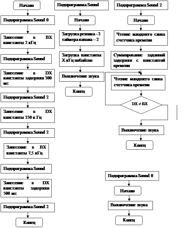 Рисунок 2.9 – Блок – схема основной программы Основная программа stac segment db 64 dup (0) ends data segment stQ db 13,10,'' ends code segment assume ds:data, cs:code, ss:stac Start: mov ax,data mov ds,ax mov es,ax mov ah,09h lea dx,stQ int 21h m0: call Sound0 mov bx,00efh call Sound mov dx, 0009h call Sound2 mov dx, 0003h call Sound2 mov bx,007eh call Sound mov dx, 000fh call Sound2 mov ah,02h int 16h and al,00100000b jz m0 jmp m_end Sound0 Proc near in al,[61h] and al,0fch out [61h],al ret Endp Sound Proc near mov bx,04a9h mov dx,0043h mov al,0beh out dx,al dec dx mov al,bl out dx,al mov al,bh out dx,al in al,[61h] or al,03h out [61h],al ret Endp Sound2 Proc near xor ax,ax mov es,ax mov ax,es:[046ch] add dx,ax m1: mov ax,es:[046ch] cmp dx,ax jnz m1 in al,[61h] and al,0fch out [61h],al ret Endp m_end: mov ax,4c00h int 21h ends END Start
