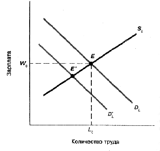 Рис. 1.1. Падение цен на продукцию. На графике изображена возрастающая кривая предложения рабочей силы SL некоторой отрасли. Кривая спроса DL является понижающейся, отражая падающую отдачу труда. Первоначально равновесие устанавливается в точке Е при уровне зарплаты W0 и занятости L0 . При снижении цены на продукцию отрасли спрос на нее так же падает. Это сдвигает кривую спроса на рабочую силу до положения, занимаемого кривой DL ’. Равновесие перемещается в точку Е’, в которой ниже и уровень занятости, и уровень оплаты труда.