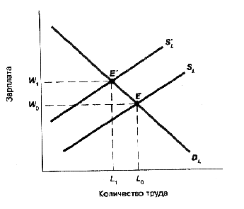Рис. 1.2. Повышение заработной платы в других отраслях экономики. Когда увеличивается зарплата в других отраслях, работники покидают данную отрасль с целью получения более высокооплачиваемых работ вне своей отрасли. Соответственно кривая предложения труда в данной отрасли сдвигается вверх влево до положения, занимаемого кривой SL ’. В результате точка равновесия смещается с Е до Е’, зарплата увеличивается с W0 до W1, а занятость падает с L0 до L1 . Так процесс увеличения зарплаты распространяется по всей экономике. Характерный наклон кривой предложения труда показывает, что повышающаяся заработная плата стимулирует работника к труду лишь до определенного момента. В течение этого периода досуг и свободное время приносятся в жертву интересам высокого заработка. По достижении высокого материального положения и благосостояния работник приостановит дальнейшее предложение своего труда и откажется от дополнительной занятости даже при продолжающемся росте заработной платы. Для данного работника "эффект дохода" не является больше Приоритетным и приносится в жертву ради альтернативного работе времяпровождения и досуга. "Эффект дохода" замещается "эффектом досуга". В целом на рынках труда предложение рабочей силы формируется под воздействием совокупности следующих условий: - общая численность населения; - численность активного трудоспособного населения; - количество отработанного времени за год; - качественные параметры труда, его квалификации, производительности, специализации. Общий уровень производительности труда зависит от кооперации капитала, ресурсов, технологий, совершенных методов производства. От них зависит и общий уровень оплаты труда, однако он повышается и тогда, когда предложение труда ограниченно по сравнению с другими факторами производства и фиксированным спросом на рабочую силу. На конкурентных рынках рабочей силы цена или заработная плата устанавливается как конкурентное равновесие спроса и предложения по различным категориям работников, по видам работ, по наличию и отсутствию профсоюзов, влияющих на спрос и предложение труда и добивающихся повышения его оплаты для занятой части работников. Заработная плата выступает одной из важнейших и наиболее массовой формой дохода в любой экономике. В системе рыночных цен заработная плата является особо важной категорией еще и потому, что достигает примерно 3/4 национального дохода развитых стран. Регулирование многих процессов в экономике связано с движением заработной платы. Например, одним из показателей уровня инфляции выступает разрыв между номинальной и реальной заработной платой. Номинальная заработная плата - это сумма денежных выплат, а реальная - определяется уровнем цен на товары и услуги, покупаемые в каждый данный момент на денежную сумму заработной платы. В большинстве случаев различия в заработной плате зависят от профессионализма работников и видов выполняемых работ. Различия в оплате плате труда определяются качеством выполняемых функций, а также тем, что работа может быть приятной или неприятной, сложной или более простой. Надбавка к заработной плате увеличивает ее основную ставку за выполнение работ в ночное время, в неблагоприятных или вредных для здоровья условиях. Высококвалифицированный труд вознаграждается более высокой зар