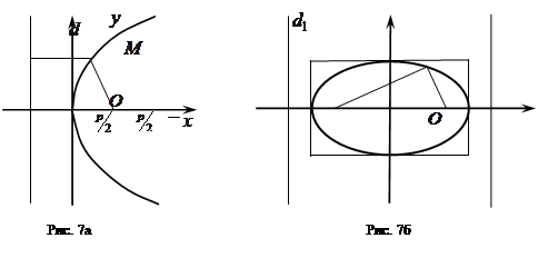 Определение. Параболой называется множество точек плоскости (см. рис.7а), для каждой из которых расстояние до данной точки (фокуса параболы) равно расстоянию до некоторой данной прямой (директрисы). Расстояние от фокуса параболы до директрисы называется параметром параболы. Парабола – симметричная кривая; точка пересечения параболы с ее осью симметрии называется вершиной параболы.