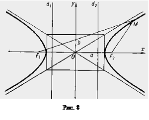 Определение. Гиперболой называется множество точек плоскости (см. рис.8) , модуль разности расстояний которых до двух данных точек и (фокусов гиперболы) постоянен и равен . Фокусное расстояние обозначают через . Прямая, на которой лежат фокусы, называется действительной (или фокальной осью) гиперболы. Прямая, проходящая через центр гиперболы , перпендикулярно к действительной оси, называется