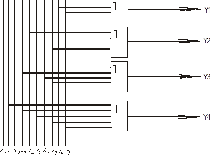 2. Получают логическую функцию шифратора в виде СДНФ путем записи “по единицам” (табл.1): y1=x8+x9; y2=x4+x5+x6+x7; y3=x2+x3+x6+x7; y4=x1+x3+x5+x7+x9 3. Используя полученные уравнения можно синтезировать функциональную схему шифратора в логическом базисе И, ИЛИ, НЕ (рис.1):