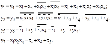 Символом “х” в табл. 2 обозначены безразличные состояния выходных переменных. 6. Для нахождения МДНФ применяют диаграммы Вейча-Карно (рис.2). Из табл.2 видно, что y1=y4; y2=y3; y5=y6.