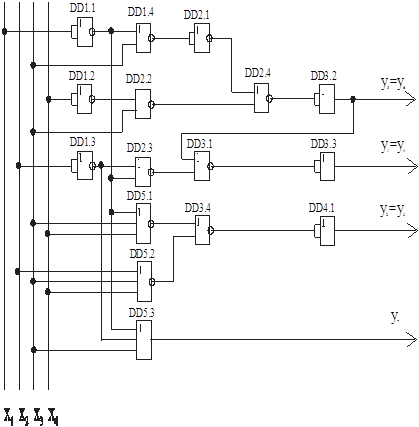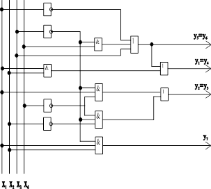 Рис.1. Функциональная схема шифратора на логических элементах или для синтеза шифратора в логических базисах И-НЕ или ИЛИ-НЕ следует применить закон двойной инверсии и закон инверсии (закон Де Моргана):