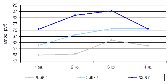 Снижение доходов граждан привело к тому, что владельцы автомобилей стали меньше использовать свои транспортные средства и покупать полисы ОСАГО сезонного использования, либо пользоваться одним автомобилем из нескольких имеющихся. Кроме того, резкое замедление роста автопарка и продаж новых автомобилей практически свели на нет быстрый рост сборов по ОСАГО, наблюдаемый в последние несколько лет. Диаграмма 1.7. Динамика ежеквартальных премий по ОСАГО, 2006 – 2008 гг.