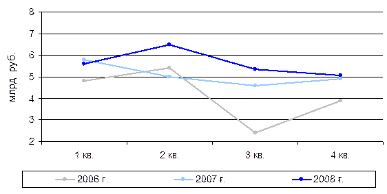 Сборы по личному страхованию , для которого характерна высокая сезонность (большая часть страховых премий, собираемых по видам страхования, входящим в данную группу, традиционно приходится на 1 квартал), показали заметное снижение темпов роста уже начиная с 3 квартала 2008 года. Так, сезонный спад 3 квартала, характерный для сборов по личному страхованию и составлявший в 2007 году - 20%, в 2008 году достиг – 34%, а небольшое оживление в данном секторе, присущее 4 кварталу и составлявшее в 2007 г. 12% прироста, сменилось спадом в – 3%. Диаграмма 1.4. Динамика ежеквартальных премий по личному страхованию (кроме страхования жизни), 2006 – 2008 годов
