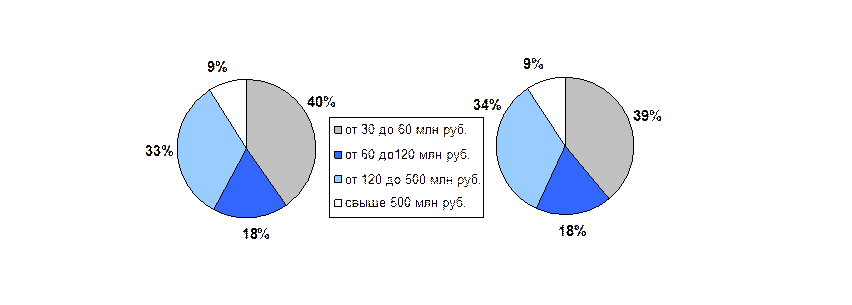 Распределение страховщиков по группам в зависимости от величины уставного капитала за прошедший год практически не изменилось. По итогам 2008 года доля страховых организаций с уставным капиталом от 30 до 60 млн. рублей сократилась на один процентный пункт по сравнению с 2007 годом. Доля страховых организаций с уставным капиталом от 120 до 500 млн. рублей выросла с 33% до 34%. Диаграмма 2.2. Распределение страховых организаций в зависимости от размера уставного капитала, 2007-2008 гг.