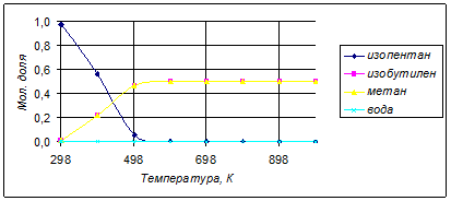 Рис. 3. Зависимость адиабатического перепада температур от степени конверсии Выводы Как видно, характерной особенностью процесса является линейное увеличение адиабатического перепада температур в зоне реактора при увеличении степени конверсии исходного вещества. Это обуславливает некоторые технологические особенности промышленного процесса дегидрирования н- бутана. Реактор процесса дегидрирования представляет собой колонну, снабженную провальными тарелками. Реакционная смесь подается вниз колонны и пары поднимаются через тарелки, проходя слой катализатора. При этом, как ясно видно из результатов расчетов, реакционная смесь охлаждается, и процесс дегидрирования замедляется. Во избежание подобного вверх колонны подается подогретый катализатор, регенерированный в регенераторе. Более горячий катализатор контактирует с частично прореагировавшей смесью, и наоборот, чем достигается выравнивание скоростей реакции по всему объему. На регенерацию закоксованный катализатор поступает, стекая по десорберу, где его отдувают от углеводородов азотом. Таким образом, за счет дополнительного подогрева регенерированного катализатора и подачи его вверх колонны реактора достигается выравнивание температуры процесса. Задание №1 Выполнить полный количественный анализ процесса пиролиза изопентана с образованием метана и изобутилена. Дать анализ зависимостей равновесной степени конверсии изопентана и состава равновесной смеси от варьируемых параметров. Аргументировать технологические особенности промышленных процессов пиролиза углеводородов и конструктивные особенности реакторов пиролиза. Решение: Проведем предварительный расчет процесса. Для этого необходимо ввести допущение, что побочных реакций не протекает, селективность процесса по целевому продукту 100%, то есть упрощенная схема реакции имеет вид: