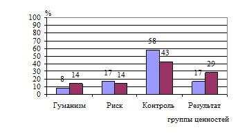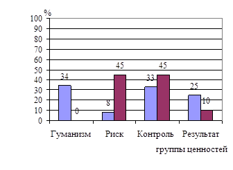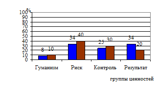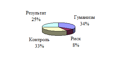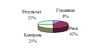 Рис. 6. Процентное соотношение групп ценностей у руководителя организации №1. Из диаграммы мы видим, что для данного руководителя приоритетны ценности, ориентированные на результат и риск. Этому человеку важна свобода, уверенность в себе, способность действовать самостоятельно и максимально полное использование своих возможностей, сил и способностей. Он стремиться к материальному благополучию. Предъявляет высокие требования к жизни и считает, что при помощи своей твердой воли, решительности и широкого кругозора он достигнет своей цели. Руководитель организации №2.