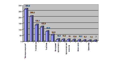Аудитория одного номера, тыс.чел. По данным исследований, проведенных независимой исследовательской компанией TNS Gallup Media рейтинг печатных СМИ города Красноярска года показывает, что газета «Телевизор» занимает первое место среди газет распространяемых через сеть розничных продаж и третье место в общем списке газет, с учетом бесплатно распространяемых газет «Всем, всем, всем» и «Шанс». Аудитория одного номера газеты «Телевизор» составляет 140 000 человек (рисунок 1).