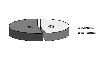 Рисунок 1 - Пол Основной аудиторией газеты «Телевизор» являются люди в возрасте от 15 до 54 лет. Распределение читателей по полу в целом повторяет половое распределение городского населения (рисунок 2), женщины читают «Телевизор» немного больше, чем мужчины (53 % аудитории женщины) (рисунок 1).
