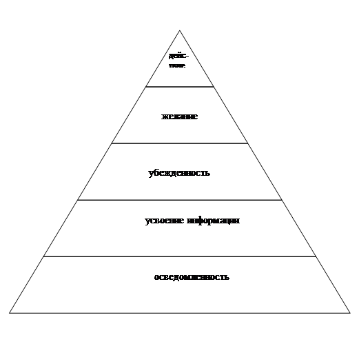 Для успешного проведения кампании по продвижению необходимо ответить на следующие вопросы [13,С.58]: Кто? Кто является вашими клиентами сейчас и в будущем. Вы должны правильно сегментировать рынок для того, чтобы точно представлять, на кого направлена реклама. Для чего? Чего вы пытаетесь достичь? Увеличение объема продаж? Представления нового продукта? Удержание или завоевание долей рынка? Создать себе имидж или поддержать его. Когда? Для рекламы очень важно время ее проведения. Лучший промоушн будет сведен на нет, если не будет проведен вовремя. Что? Какова специфика продукта (услуги) который вы пытаетесь продвинуть на рынок. В чем уникальность его продажи? Где? Какое средство массовой информации наиболее подходит для проведения вашей рекламной кампании. Как? Пользоваться ли услугами рекламного агентства, если да то какого. Вам необходимо достаточно сделать для запуска своего бизнеса. Вы должны внимательно изучить и одобрить предлагаемую вам рекламную кампанию. На что должно расходоваться время при планировании продвижения. Разработка плана рекламных мероприятий. Разработка плана рекламы включает в себя девять этапов [18,С.121]. Первый этап: Установление целей. Второй этап: Установление ответственности. Третий этап: Определение бюджета. Четвертый этап: Разработка тем. Пятый этап: Выбор средств рекламы. Шестой этап: Создание рекламных объявлений. Седьмой этап: Выбор времени рекламы. Восьмой этап: Анализ совместных усилий. Девятый этап: Оценка полученного результата (успех/неудача). Установление целей. Иерархию рекламных целей можно наглядно представить с помощью пирамиды, каждый последующий уровень которой меньше предыдущего. До введения на рынок нового товара покупатели, естественно, ничего о нем не знают, следовательно, первая задача рекламы – заложить фундамент пирамиды путем ознакомления некоторой части потенциальных покупателей. Следующий уровень пирамиды – усвоение информации не только о существовании товара, но и о его назначении и некоторых свойствах. Далее реклама должна убедить определенное число людей в ценности предлагаемого товара (уровень убежденности). Из убежденных в полезности товара некоторые переместятся на следующий уровень – в число тех, кто желает иметь данный товар. И лишь очень незначительный процент от первоначального числа потенциальных потребителей достигнет уровня действия и пойдет в магазин, чтобы купить товар.