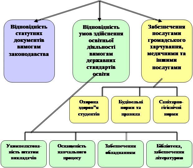 Відповідно ст.22 Закону України “Про вищу освіту” [1] основною метою діяльності вищого навчального закладу (ВНЗ) є забезпечення умов, необхідних для отримання особою вищої освіти, підготовка фахівців для потреб України. Головними завданнями ВНЗ визначено здійснення освітньої діяльності, яка відповідає стандартам вищої освіти, здійснення наукової й науково-технічної, творчої, мистецької, культурно-виховної, спортивної та оздоровчої діяльності, здійснення підготовки наукових і науково-педагогічних кадрів, забезпечення культурного і духовного розвитку особистості та виконання державного замовлення і угод на підготовку фахівців, вивчення попиту на окремі спеціальності на ринку праці й сприяння працевлаштуванню. Держава організує і контролює процес якісної підготовки фахівців шляхом комплексного оцінювання ВНЗ, використовуючи процедури ліцензування освітньої діяльності, акредитації напрямів, спеціальностей та ВНЗ в цілому [2] та державної атестації випускників. Показники, які аналізуються під час проведення ліцензування та акредитації представлені на рис. 1.