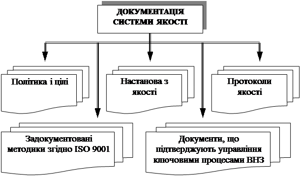 Рис. 3 Аналізіпорівняннявимог, якімаєвиконатиВНЗуходіякдержавної, такінедержавноїакредитаціїсвідчитьпроїхспорідненість. Загаломжецівимоги, атакожметаізавданняВНЗкореспондуютьсязпринципамиTQM тастандартамиISO 9000, впершучергу, орієнтацієюнапотребисуспільстватаіншихзаінтересованихсторін, необхідністюпідготовкивисококваліфікованихкадрів, організацієюпроцесунабору, працевлаштуваннястудентівтощо. У цьому сенсі система якості ВНЗ на основі принципів TQM є ефективним інструментом для досягнення мети і головних завдань діяльності ВНЗ, а також успішного проходження процедур ліцензування і акредитації. Таким чином, якщо ВНЗ ставить на меті досягнення високого рівня якості підготовки випускників, отримання державної і недержавної акредитації через розроблення, впровадження та сертифікацію власної системи якості, то до акредитаційних вимог додаються й вимоги до системи управління якістю, встановлені у ДСТУ ISO 9001:2001. Це стосується, зокрема, й вимог до документації ВНЗ (рис. 4).