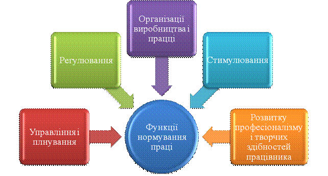Розглянемо кожну з функцій: 1. Управління і планування – це розрахунок норм праці на підприємстві. 2. Регулювання – ця функція використовується з метою регулювання і контролю діяльності структурних підрозділів. 3. Організації виробництва – вона включає в себе аналіз організаційно-технічних умов виконання праці, а також методів і прийомів. 4. Стимулювання – стимулювання ефективності праці; ця функція віддзеркалює залежність рівня заробітної праці від установлених норм і результативності праці. 5. Розвиток професіоналізму і творчих здібностей працівника – ця функція в умовах ринкових відносин зростає, тому, чим вище професіоналізм працівника, тим вища ефективність виконання ним норм праці. Слід відмітити, що кожну з цих функцій не можна розглядати як домінуючу, бо кожна з них спрямована на забезпечення економії робочого часу та підвищення ефективності його використання. Метою нормування праці є скорочення витрат на виготовлення продукції (послуг), підвищення продуктивності та якості праці, сприяння розширенню виробництва та зростанню доходів працівників на основі впровадження техніко-технологічних нововведень і вдосконалення організації виробничих і трудових процесів.