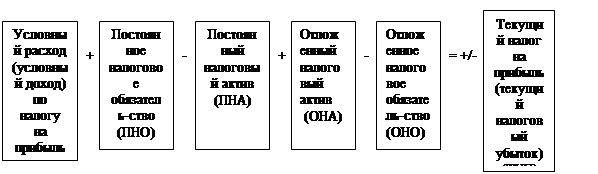 Рис. 2.1 Схема расчета текущего налога на прибыль С учетом этой схемы (рис.2.1) и данных бухгалтерского учета текущий налог на прибыль определяется по следующей формуле: ТНП = УРНП + ПНО - ПНА + ОНА-ОНО, где ТНП - текущий налог на прибыль; УРНП - условный расход по налогу на прибыль; ПНО - постоянное налоговое обязательство; ПНА – постоянный налоговый актив; ОНА - отложенный налоговый актив (при расчете берется в виде разницы между дебетовым и кредитовым оборотами по счету 09; - если кредитовый оборот превышает дебетовый оборот, то разница учитывается со знаком «плюс», если наоборот, то со знаком «минус»); ОНО - отложенное налоговое обязательство (при расчете берется в виде разницы между кредитовым и дебетовым оборотами по счету 77; - если дебетовый оборот превышает кредитовый оборот, то разница учитывается со знаком «плюс», если наоборот, то со знаком «минус»). Величина текущего налога на прибыль, сформированного в системе бухгалтерского учета, определяется в виде сальдо на счете 68 «Расчеты по налогам и сборам» (субсчет 68-2). Для понятия механизма отражения расчетов по налогу на прибыль в системе бухгалтерского учета приведем пример расчета текущего налога на прибыль. За первый отчетный квартал 2009 года по данным бухгалтерского учета в отчете о прибылях и убытках ЗАО ПТК «Владспецстрой» отразила прибыль до налогообложения (бухгалтерскую прибыль) в сумме 1 380 750 рублей (табл. 2.1). Таблица 2.1 Отчет о прибылях и убытках (в сокращенной форме)