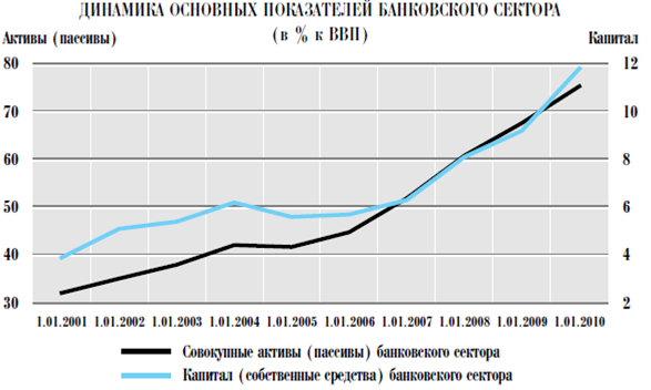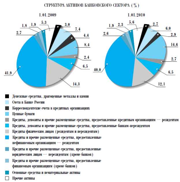 Рис.4. Структура активов банковского сектора Структура активов кредитных организаций. Активные операции кредитных организаций в 2009 году характеризовались прежде всего стагнацией кредитования нефинансовых организаций и сокращением кредитования физических лиц, что было обусловлено ухудшением общеэкономической ситуации и финансового положения заемщиков. Кроме того, в ответ на негативные внешние условия банки стали применять более консервативные подходы к оценке кредитных рисков. Суммарный объем кредитов указанным категориям заемщиков за 2009 год сократился на 2,5% — до 16 115,5 млрд. рублей — при снижении их удельного веса в активах банковского сектора с 59,0 до 54,8%. Относительно ВВП совокупный объем банковских кредитов нефинансовым организациям и физическим лицам увеличился с 39,9 до 41,3%, что было обусловлено более существенным снижением номинального ВВП. Объем кредитов и прочих размещенных средств, предоставленных нефинансовым организациям, за 2009 год увеличился лишь на 0,3% (в 2008 году — на 34,3%)— до 12 541,7 млрд. рублей, а их доля в активах банковского сектора снизилась с 44,6% на 1.01.2009 до 42,6% на 1.01.2010. Основной объем данных кредитов (72,7% на 1.01.2010) предоставлен в рублях. Объем кредитов, предоставленных физическим лицам, сократился за 2009 год на 11,0% — до 3573,8 млрд. рублей (в 2008 году темп прироста составил 35,2%), а их доля в суммарном объеме выданных банковским сектором кредитов снизилась с 20,2 до 18,0%, в совокупных активах банковского сектора — с 14,3 до 12,1%. Основная часть кредитов физическим лицам (88,7% на 1.01.2010) выдана в рублях. На фоне стагнации кредитования заметно вырос интерес банков к вложениям в ценные бумаги, что было обусловлено положительной динамикой российских фондовых индексов, а также большей ликвидностью этих инструментов по сравнению с кредитами, возможностью оперативного использования ценных бумаг в качестве обеспечения по кредитам Банка России. За 2009 год объем вложений в ценные бумаги вырос на 82,2% (в 2008 году — на 5,1%) — до 4309,4 млрд. рублей, а их доля в активах банковского сектора увеличилась с 8,4 до 14,6%. Основной удельный вес в портфеле ценных бумаг по-прежнему занимали вложения в долговые обязательства: 74,4% на 1.01.2009, 78,4% на 1.01.2010. Их объем вырос за 2009 год на 92,0% (за 2008 год — на 14,2%) — до 3379,1 млрд. рублей. Удельный вес учтенных векселей в портфеле ценных бумаг уменьшился за 2009 год с 8,4 до 5,4%. Удельный вес вложений в долевые ценные бумаги в портфеле ценных бумаг на 1.01.2010 составил 9,6% (на 1.01.2009 — 8,2%). За 2009 год их объем удвоился и достиг 411,8 млрд. рублей (в 2008 году отмечалось снижение вложений в долевые ценные бумаги на 38,8%). Стабилизация ситуации на валютном рынке и рост курса рубля к доллару США во второй половине 2009 года обусловили снижение валютной составляющей в активах банковского сектора. Прибыль действующих кредитных организаций за вычетом убытков за 2009 год сократилась на 49,9% по сравнению с 2008 годом (за 2008 год — на 19,4% по сравнению с 2007 годом) и составила 205,1 млрд. рублей. Рентабельность активов кредитных организаций в 2009 году составила 0,7%, рентабельность капитала — 4,9% (в 2008 году — 1,8 и 13,3% соответственно). 2.2 Проблемы развития банковской системы в РФ Банковская система имеет некоторые проблемы развития: 1. Банковская система России развивается как ведомая, обслуживающая, а не ведущая сфера экономики. Экономический рост, исполнение бюджета, спрос 