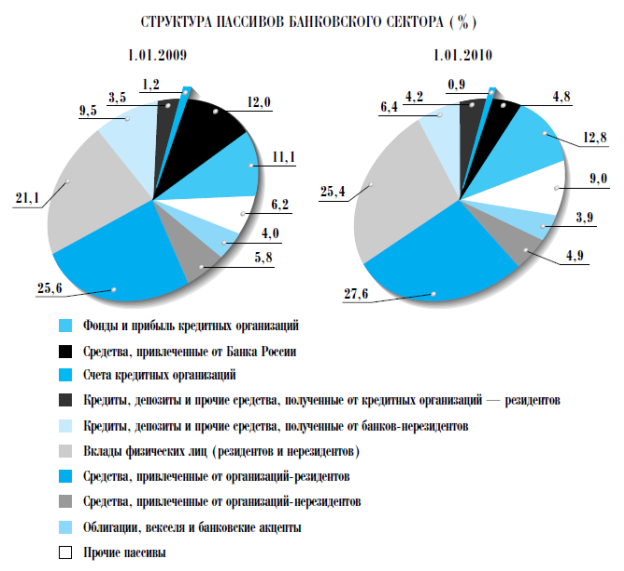 Рис.3. Структура пассивов банковского сектора Структура пассивов кредитных организаций. В 2009 году наблюдался процесс замещения традиционными источниками антикризисных источников фондирования, введенных Банком России и Правительством РФ. Оживление во второй половине 2009 года производства, приток вкладов населения снизили потребность кредитных организаций в использовании антикризисных инструментов пополнения ликвидности, в первую очередь кредитов без обеспечения Банка России. За 2009 год объем кредитов, депозитов и прочих привлеченных средств, полученных кредитными организациями от Банка России, сократился в 2,4 раза — до 1423,1 млрд. рублей; на 1.01.2010 на этот источник приходилось 4,8% пассивов банковского сектора. Остатки средств на счетах клиентов за 2009 год увеличились на 16,2% — до 17 131,4 млрд. рублей, а их доля в пассивах банковского сектора выросла с 52,6 до 58,2%. Стабильным источником формирования ресурсной базы кредитных организаций были вклады населения. За 2009 год совокупный объем вкладов физических лиц увеличился на 26,7% (на 14,5% за 2008 год) — до 7485,0 млрд. рублей, при этом их доля в пассивах банковского сектора выросла с 21,1% на 1.01.2009 до 25,4% на 1.01.2010. В 2009 году восстановился характерный для докризисного периода опережающий рост рублевых вкладов: они увеличились на 27,2%, а вклады в иностранной валюте — на 21,8%. В условиях определенной стабилизации ситуации в банковском секторе ряд кредитных организаций продолжал агрессивную процентную политику, выработанную осенью 2008 года, в период намечавшегося оттока вкладов. В результате в 2009 году наблюдался переток части вкладов из некоторых банков с государственным участием в частные банки. Так, удельный вес Сбербанка России ОАО во вкладах физических лиц за 2009 год сократился с 51,9 до 49,4%. Суммарный объем средств, привлеченных от организаций (за исключением кредитных организаций), вырос за 2009 год на 8,9% (за 2008 год — на 24,4%) — до 9557,2 млрд. рублей; доля данной статьи в пассивах банковского сектора увеличилась с 31,3 до 32,5%. При этом объем депозитов юридических лиц за 2009 год вырос на 10,5% (в 2008 году — на 40,5%). За 2009 год темп прироста остатков средств организаций на расчетных и прочих счетах по сравнению с 2008 годом повысился с 8,9 до 9,6%, а доля данной статьи в пассивах выросла с 12,6% на 1.01.2009 до 13,1% на 1.01.2010. В 2009 году возможности кредитных организаций по выпуску долговых обязательств (облигаций и векселей) были ограничены относительно невысоким спросом. Доля выпущенных облигаций в пассивах банковского сектора увеличилась с 1,3 до 1,4%, а доля выпущенных банками векселей сократилась с 2,7 до 2,5%.