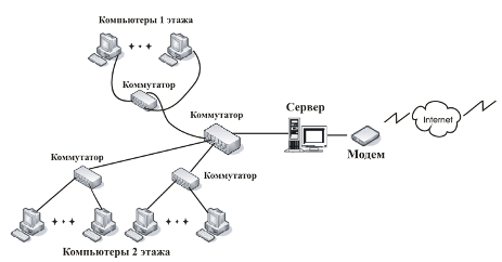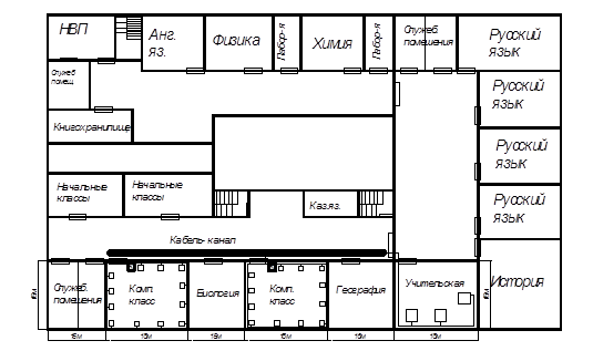 Рисунок 2.1 – Логическая организация сети 2.2 Физическая организация сети Под физической организацией сети понимается конфигурация связей, образованных отдельными частями кабеля. На рисунках 3.2, 3.3 приведены планы второго и первого этажа школы, где наглядно можно увидеть, как будет построена сеть, где будут размещены компьютеры, коммутаторы, сервер и как они будут соединены.