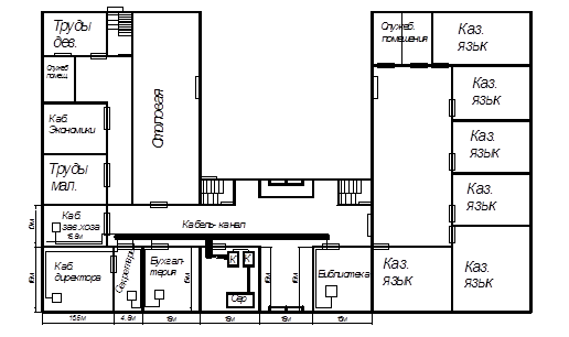 Рисунок 2.3 – План второго этажа здания 3. Теоретико-расчетная часть 3.1 Расчет длины кабеля и кабель-канала При расчете длины горизонтального кабеля учитываются следующие очевидные положения. Каждая телекоммуникационная розетка связывается с коммутационным оборудованием одним кабелем. В соответствии со стандартом ISO/IEC 11801 длина кабелей горизонтальной подсистемы не должна превышать 90 м. Кабели прокладываются по кабельным каналам. Принимаются во внимание также спуски, подъемы и повороты этих каналов. Существует два метода вычисления количества кабеля для горизонтальной подсистемы: – метод суммирования; – эмпирический метод. Метод суммирования заключается в подсчете длины трассы каждого горизонтального кабеля с последующим сложением этих длин. К полученному результату добавляется технологический запас величиной до 10%, а также запас для выполнения разделки в розетках. Достоинством рассматриваемого метода является высокая точность. Однако при отсутствии средств автоматизации и проектировании СКС с большим количеством портов такой подход оказывается чрезмерно трудоемким. В своей работе я решила воспользоваться эмпирическим методом. Его сущность заключается в применении для подсчета общей длины горизонтального кабеля, затрачиваемого на реализацию конкретной кабельной системы, обобщенной эмпирической формулы.