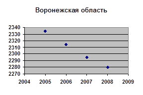 По данным Федеральной службы государственной статистики в период с 2005 по 2008 год наблюдается снижение численности трудового населения в Воронежской и Липецкой области Российской Федерации. В Воронежской области население сократилось с 2334 тысяч до 2280 тыс. человек, что составляет 54 тыс. человек. В Липецкой области численность трудового населения снизилось с 1190тыс. до 1169тыс, что составляет 21 тыс. человек. 2. Численность экономически активного населения ( тыс человек)