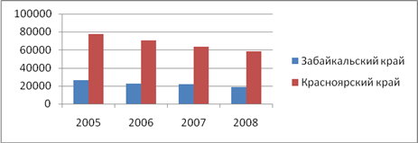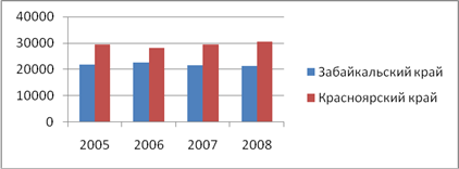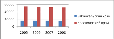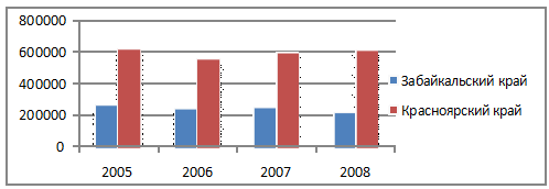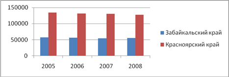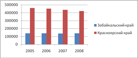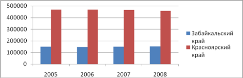 Численность экономически активного населения по данным Федеральной службы государственной статистики в период с 2005 по 2008 год повысилась в Забайкальском крае и сократилась в Красноярском крае. В Забайкальском крае рост экономически активного населения наблюдался в 2006 и 2008 годах, за весь период численность повысилась на 37342 человек. В Красноярском крае в 2006 году численность экономически активного населения достигала максимума за весь исследуемый период (2343477 человек), в целом сокращение составило 17993 человека. 3. Численность экономически неактивного населения (человек)
