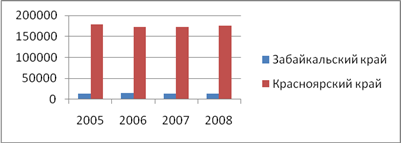 По статистическим данным численность населения занятого в строительной отрасли в Красноярском крае превышает численность в Забайкальском. С 2005 по 2008 год в Забайкальском крае количество работников возросло на 3698 человек, а в Красноярском на 16317, причем увеличение работников происходит равномерно за все время исследуемого периода. Транспорт и связь