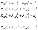 КоэффициентRkk — собственное сопротивление контура, равное сумме сопротивлений всех ветвей ячейки, а коэффициент Rik =Rki (i<>k) – взаимное сопротивление контуров, равное сопротивлению общей для контуров i и k ветви, взятому с отрицательным знаком, которым учитываются встречные направления контурных токов в рассматриваемой ветви. Каждое уравнение системы выражает условие равновесия напряжений ветвей контура – резистивных и источников напряжения (в правой части). Слагаемое на главной диагонали Составление уравнений сводится к записи симметричной матрицы параметров контурных токов: