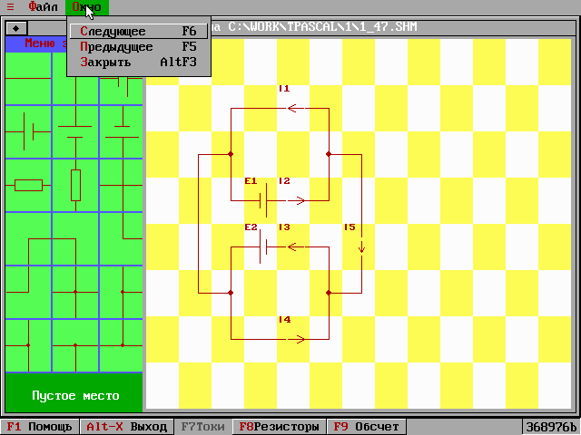 Если ветвь присоединена к базисному узлу (j=0) то она внесет добавкуGk , только в собственную проводимость Gii и добавку i0k в составляющую iiy вектора узловых токов. Учет данных последней ветви завершает формирование узловых проводимостей и вектора узловых токов. Таким образом в настоящей дипломной работе:· проведен литературный обзор по моделированию процессов в радиотехнических цепях, методов и средств расчетов токов и направлений в них;· построена математическая модель разветвленной цепи постоянного тока;· на языке программирования Турбо Паскаль версии 7.0. в удобном графическом интерфейсе разработана программа построения и анализа электрической схемы цепи постоянного тока; · приведены методические пояснения при работе с разработанной программой, а также расчетов и анализа электрических цепей; · программа допускает без принципиальных изменений расширение её функциональных возможностей для расчетов цепей переменного тока, а также моделирования и анализа электромагнитных полей; · результаты настоящей дипломной работы могут быть использованы в учебном процессе, при разработке электронной аппаратуры в научных лабораториях и на производстве. В заключение хочу выразить благодарность своим научным руководителям: Цыпишка Дмитрию Ивановичу, Брагарь Луке Федеровичу и заведующиему кафедрой кафедрой общей физики и методики преподавания физики Стамову Ивану Григорьевичу, за методическую помощь, оказанную при написании дипломной работы. 1. К.С. Демирчан, П.А. Бутырин. Моделирование и машинный расчет электрических цепей. М., «Высшая школа», 1988г. 2. В. Нерретер. Расчет электрических цепей на ПЭВМ. М., «Энергоатомиздат», 1991г. 3. Пантюшин В.С. Сборник задач по электротехнике и основам электронники. М., «Высшая школа», 1979г. 4. П.Н. Махтанов. Основы анализа электрических цепей. Линейные цепи. М., «Высшая школа», 1990г. 5. «Электротехника». Под редакцией проф. В.С. Пантюшина. М., «Высшая школа», 1976г. 6. В.Г. Абрамов, Н.П. Трифонов, Г.Н. Трифонова. «Введение в язык Паскаль». М., «Наука», 1988г. 7. Ж.Джонс, К. Харроу. «Решение задач в системе Турбо Паскаль». М., «Финансы и статистика», 1991г. 8. К. Боон. «Паскаль для всех». М., «Энергоиздат», 1988г. 9. Д. Прайс. «Программирование на языке Паскаль». Практическое руководство. М., «Мир», 1987г. I. Рисунки с видами экрана при работе с программой....................................................... 20 Рисунок №1. Общий вид экрана...................................................................................................... 20 Рисунок №2. Меню – Файл.............................................................................................................. 21 Рисунок №3. Открытие файла, сохраненного на диске.................................................................. 22 Рисунок №4. Вид экрана с изображением схемы........................................................................... 23 Рисунок №5. Вывод результата вычисления токов в ветвях схемы.............................................. 24 Рисунок №6. Просмотр направления токов в ветвях схемы.......................................................... 25 Рисунок №7. Вид экрана при сохранении схемы в файл................................................................. 26 Рисунок №8. Меню – Окно.............................................................................................................. 27 Рисунок №9. Окно помощи выводимое на экран при нажатии клавиши F1.................................... 29 II. Листинг программы на языке Паскаль............................................................................... 30 1. Основная программа.................................................................................................................. 30 2. Модуль с библиотекой эле
