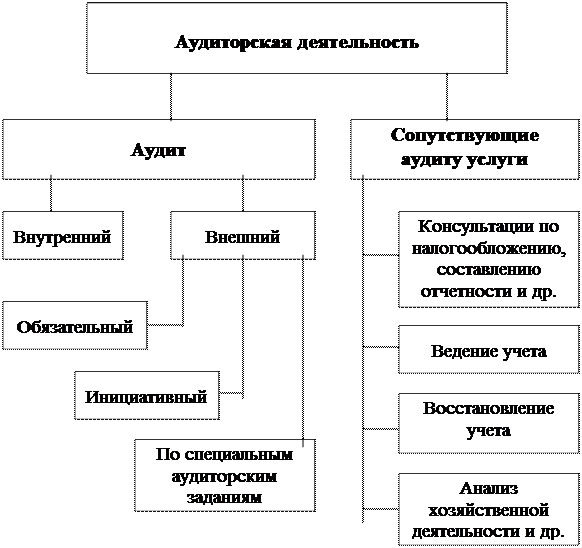 Рис.1.1 Классификация аудиторской деятельности. Приведенная классификация позволяет рассмотреть цели и задачи различных видов аудиторской деятельности. Самая примитивная форма в этом отношении принадлежит именно внешнему аудиту, цель и основные задачи которого приведены в Федеральном законе «Об аудиторской деятельности», федеральных правилах (стандартах) аудиторской деятельности. Главная цель внешнего аудита – дать объективные, реальные и точные сведения об аудируемом объекте. Достижению главной цели способствуют особенности (требования) ведения аудиторской деятельности: ¨ независимость и объективность при проведении проверок; ¨ конфиденциальность, профессионализм, компетентность и добросовестность аудитора; ¨ использование методов статистики и экономического анализа; ¨ применение новых информационных технологий; ¨ умение принимать рациональные решения по данным аудиторской проверки; ¨ доброжелательность и лояльность по отношению к клиентам; ¨ ответственность аудитора за последствия его рекомендаций и заключений по результатам аудиторских проверок; ¨ содействие росту авторитета аудиторской профессии. Независимость аудитора обусловливается тем, что он не является сотрудником государственного учреждения, не подчинен контрольно-ревизионным органам и не работает под их контролем, соблюдает стандарты профессионального аудиторского объединения, не имеет на проверяемых предприятиях никаких имущественных или личных интересов. Объективность обеспечивается высокой профессиональной подготовкой аудитора, большим практическим опытом, знанием новейшей методической литературы. Конфиденциальность – важнейшее требование при осуществлении аудиторской деятельности. Аудитор не должен предоставлять никакому органу каких-либо сведений о хозяйственной деятельности проверяемого им объекта. За разглашение коммерческой тайны своих клиентов он должен нести ответственность по закону, а также моральную, а если предусмотрено договором, то и материальную ответственность. Аудитор должен обладать необходимой профессиональной квалификацией, заботиться о поддержании ее на должном уровне, соблюдать требования нормативных документов. Аудитор не должен оказывать клиенту услуги в тех областях экономики, в которых не имеет достаточных профессиональных знаний. Применение методов статистики и экономического анализа позволяет организовать анализ проведенных проверок на высоком уровне, получить объективные и достоверные данные для принятия решений. Применение новых информационных технологий заключается в использовании вычислительной техники для организации аудиторской деятельности. Это касается и проведения проверки, и анализа отчетности, а также ведения и восстановления учета. По результатам проверки аудитор может сделать необходимые рациональные выводы, которые помогут клиенту в организации работы и ведения бухгалтерского учета. Ответственность аудитора проявляется в том, что он отвечает за свое заключение о финансовых отчетах проверяемого предприятия. Ответственность за содержание отчетов несет руководство проверяемого предприятия. Внешний аудит проводится на договорной основе аудиторскими фирмами или индивидуальными аудиторами с целью объективной оценки достоверности бухгалтерского учета и фи