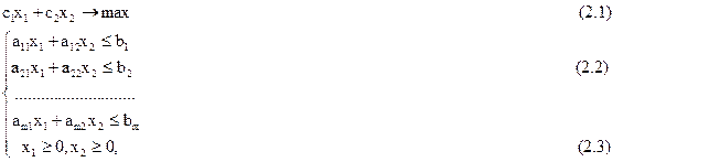 Что и требовалось доказать. Справедлива и обратная теорема. 1.3Экономико-математическая модель использования заготовленных кормов Для эффективного ведения животноводства большое значение имеет правильное использование кормов в стойловый период, ко> торый продолжается 7—8 месяцев в году, т. с. 60—70% всего времени продуктивного использования животных. В этот период имеется несколько видов кормов, что позволяет находить наилучшее их сочетание для разных видов и групп животных. Места складирования и места потребления отдельных видов кормов не всегда совпадают, что требует при их распределении учитывать как потребности животных в кормах, так и затраты на их транспортировку. В сельскохозяйственных предприятиях на стойловый период ежегодно составляется план использования заготовленных и закупаемых кормов по видам, половозрастным группам животных, а также по фермам или отделениям. Оптимизация плана использования заготовленных кормов предполагает получение максимума продукции животноводства с наименьшими затратами и сохранением поголовья на конец периода. Поэтому постановку задачи оптимизации использования кормов можно сформулировать следующим образом: определить, какие корма и в каком количестве необходимо скормить различным видам и половозрастным группам животных, чтобы получить максимальный экономический эффект от использования заготовленных кормов и покупаемых добавок. Наиболее приемлемыми критериями оптимальности являются максимальное производство животноводческой продукции или суммы чистого дохода, получаемого в животноводстве. В оптимальном плане использования кормов должны быть решены вопросы распределения имеющихся в хозяйстве кормов по видам и половозрастным группам скота и птицы, оптимальные рационы кормления для каждой группы животных, выявлены объемы приобретения белковых, минеральных и витаминных добавок, определено количество животноводческой продукции, которое можно получить при рациональном использовании кормов. Для построения экономико-математической модели оптимизации плана иснользования имеющихся кормов в хозяйстве необходима следующая информация: 1) виды кормов и кормовых добавок, которыми располагает 2) виды минеральных, витаминных добавок и возможность их 3) виды скота и птицы, разводимых в хозяйстве, и деление их 4) продуктивность и нормы кормления в расчете на одну го 5) предельно допустимые границы содержания отдельный кормов или групп кормов в рационе кормления различных половозрастных групп по видам животных и птицы; 6) количество кормо – дней пребывания различных половозрастных групп в хозяйстве на планируемый период; 7) предельно допустимые нормы ввода кормов, минеральных 8) себестоимость кормов и цены на животноводческую продукцию; 9) затраты на доставку кормов от места хранения до места 2 Раздел. Методы решения задач линейного программирования.2.1 Графический метод Рассмотрим задачу линейного программирования относительно двух неизвестных: