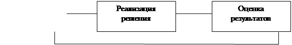 Рис. 3.1 Реализация и оценка. ОБРАТНАЯ СВЯЗЬ. Еще одной фазой, входящей в процесс принятия управленческого решения и начинающейся после того, как решение начало действовать, является установление обратной связи. По Харрисону: “Система отслеживания и контроля необходима для обеспечения согласования фактических результатов с теми, что ожидались в период принятия решения”. На этой фазе происходит измерение и оценка последствий решения или сопоставление фактических результатов с теми, которые руководитель надеялся получить. Обратная связь — т.е. поступление данных о том, что происходило до и после реализации решения — позволяет руководителю скорректировать его, пока организации еще не нанесено значительного ущерба. Оценка решения руководством выполняется, прежде всего, с помощью функции контроля. Ниже приведена еще одна схема принятия управленческого решения (Голубков Е.П.,). В данной схеме выделено больше этапов, чем у М.Х. Мескона, она является более «расписанной» (рис. 3.2). На рис. 3.2 этапы и процедуры имеют между собой прямые и обратные связи. Обратные связи отражают итеративный циклический характер зависимости между этапами и процедурами. Итерации в процессе принятия решений обусловлены необходимостью уточнения и корректировки данных после выполнения определенных процедур и возврата к работам на любой предшествующий этап.