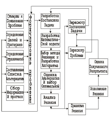 Рис. 3.2. Процесс принятия решения Таким образом, рассмотренный процесс носит итеративный характер, поэтому в ходе работы необходимо проявлять гибкость при возникновении новых факторов и проводить переоценку полученных результатов, а в некоторых случаях менять идеи, лежащие в основе решения. Такие переоценки полученных результатов нельзя считать напрасной тратой труда и времени. Конечно, постоянно изменять цели, пути и средства их достижения недопустимо. Это мешает четкой ориентации. Но не менее опасны формальное отношение к поставленной задаче и настойчивое стремление решить ее вопреки реальному ходу событий. Проведенный в свое время в США анализ практики принятия решений показал, что неуспех принятых решений на 26% обусловлен неуделением должного внимания постановке целей, на 35% — выбору альтернатив, на 25% — ресурсному обеспечению. Только 13% неудач было обусловлено другими причинами. Можно в какой-то мере говорить об универсальности алгоритма рассмотренного процесса принятия решения. Однако в различных школах управления уделяется разное внимание отдельным этапам данного процесса, использованию конкретных методов обоснования решения. Так с рассматриваемых позиций можно говорить об отличии японской школы управления от западной. В японской школе гораздо больший упор делается на определение проблемы — стоит ли ею вообще заниматься? Для обсуждения проблемы и согласования вовлекается большой круг лиц — от руководителя фирмы до рядового сотрудника. В западной школе акцент делается на решение ранее определенной проблемы, а что она заслуживает внимания, зачастую неявно предполагается. Таким образом, японцы сосредоточивают внимание на существе вопроса, требующего решения, а не на возможных вариантах решения, выбор которых предполагает столкновение точек зрения тех, кто готовит и принимает решение. При принятии решения не должно быть победителей и побежденных. Японский подход к принятию решения требует времени, которого на Западе вечно не хватает. Однако, когда проблема определена, действия осуществляются с поразительной быстротой, гораздо быстрее, чем на Западе. Японский подход предполагает отодвигание принципиальных решений до того времени, когда все факторы решения будут рассмотрены руководителем, на которого ляжет ответственность за выполнение решения. Процесс принятия решений является сложной итерационной процедурой. Структурная схема процесса принятия решений может так же иметь вид (рис. 3.3):