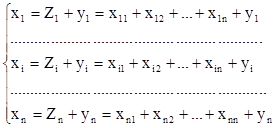 = – 1,135 Задание 3 Дайте определение коэффициентов прямых затрат. Где они могут быть использованы? Решение 1. Пусть народное хозяйство представлено n отраслями сферы материального производства. Каждая из отраслей производит один агрегированный продукт. Валовой выпуск этих продуктов отраслями обозначим x1 , x2 ,…, xn . Вся продукция xi отрасли i, i=1, 2,…, n, делится на промежуточную Zi и конечную yi . Промежуточную продукцию потребляют в процессе производства сами отрасли. Конечная продукция выходит из сферы материального производства и предназначается для непроизводственного потребления. На основе отчетных данных о деятельности отраслей за определенный период можно составить межотраслевой баланс. Обозначим xij – объем продукта i-й отрасли, используемый за отчетный период j-й отраслью. Если представить, как распределяется валовая продукция каждой отрасли по другим отраслям и в сфере потребления, то получится система балансовых уравнений.
