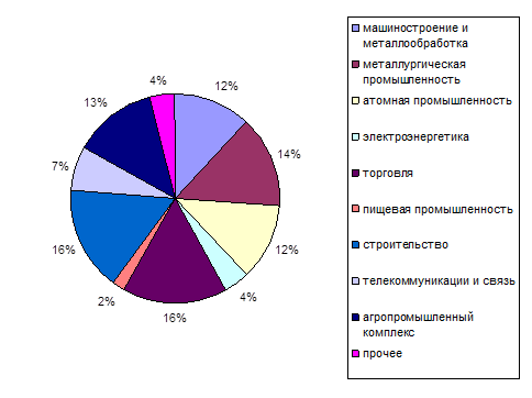 Из таблиц 3.2 и 3.3 видна тенденция к увеличению кредитного портфеля банков Ростовской области. Приоритетным направлением для Банка в сфере кредитования является предоставление кредитов в реальном секторе экономики, предприятий агропромышленного комплекса, транспорта, энергетики, металлургии и машиностроения. Банк отдает предпочтение кредитам во всех отраслях экономики со сроком реализации до трех лет при наличии достаточного обеспечения. Налажена работа с ценными бумагами и выпуск пластиковых карт. В настоящий момент в Банке кредитуется более 200 предприятий, в том числе 7 банков Ростовской области (межбанковские кредиты). Отрасли промышленности, в которых кредитует Банк, отображены на диаграмме: Диаграмма 2.1. Структура кредитного портфеля Банка